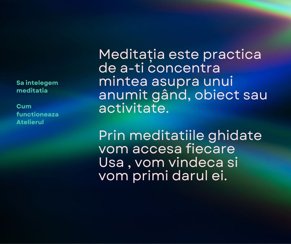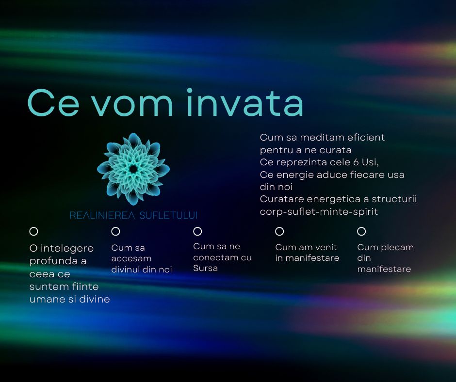 Atelierul celor 6 Usi va invita intr-o calatorie interioara de auto-cunoastere, de reconectare cu Sursa si de activare a potentialului nostru Creator.